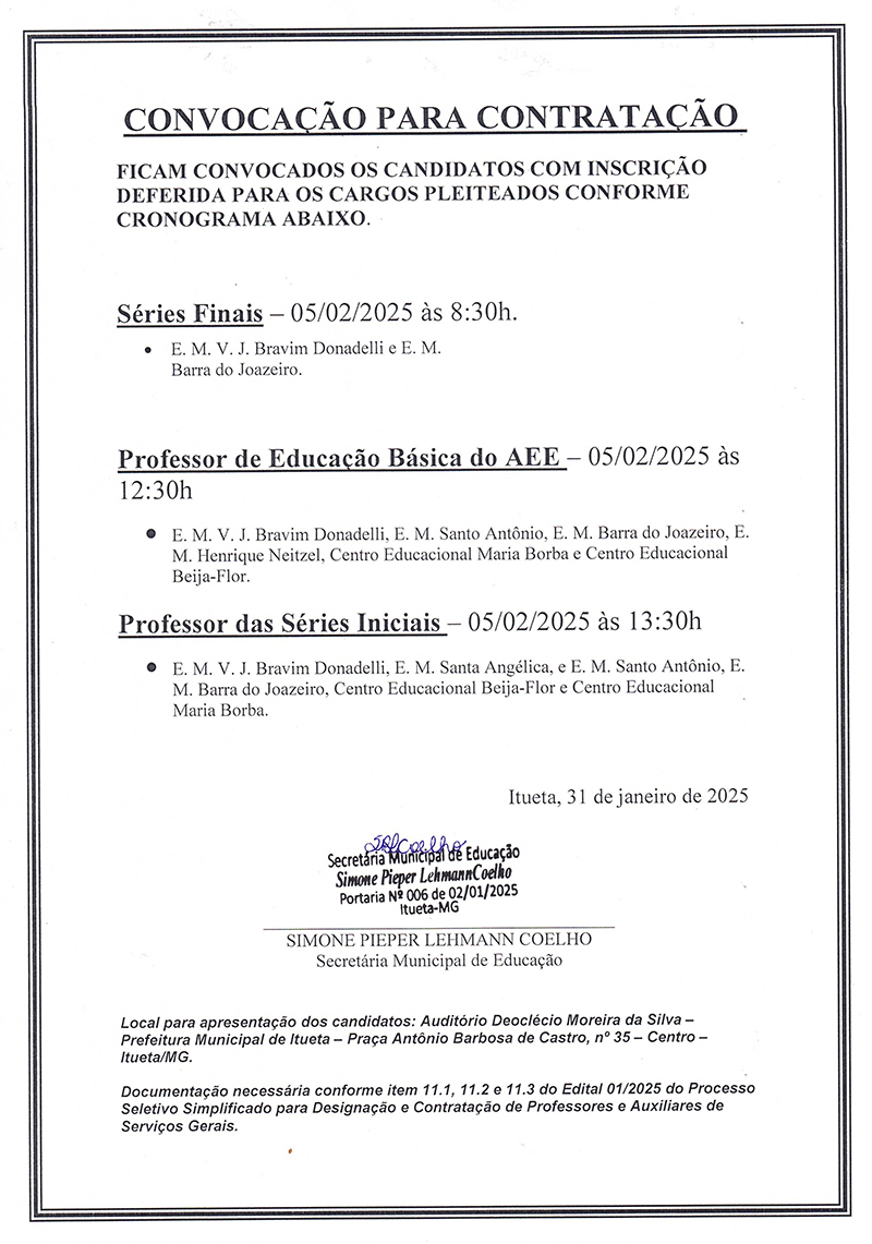 Página inicial > Últimas Notícias > CONVOCAÇÃO PARA CONTRATAÇÃO (Professor) - Processo Seletivo Simplificado - Edital nº 01/2025