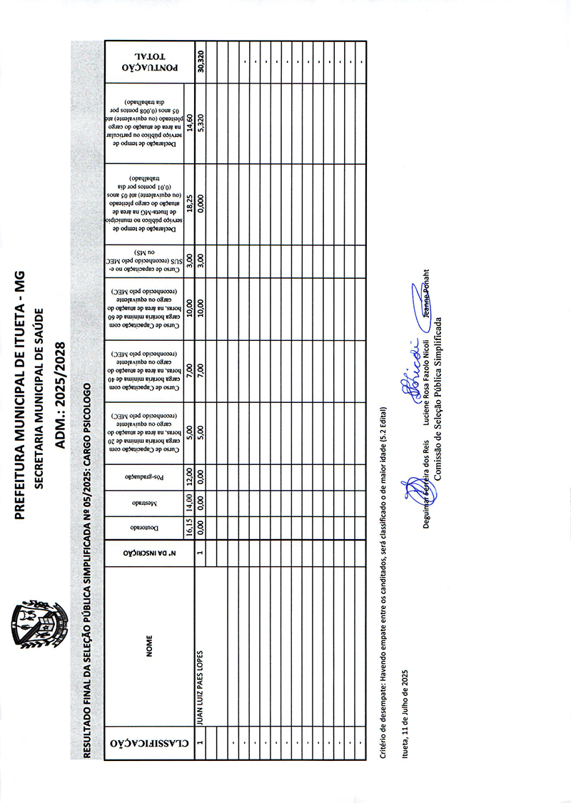 Resultado Final - Processo Seleção Pública Simplificada (Saúde) - Edital nº 05/2025