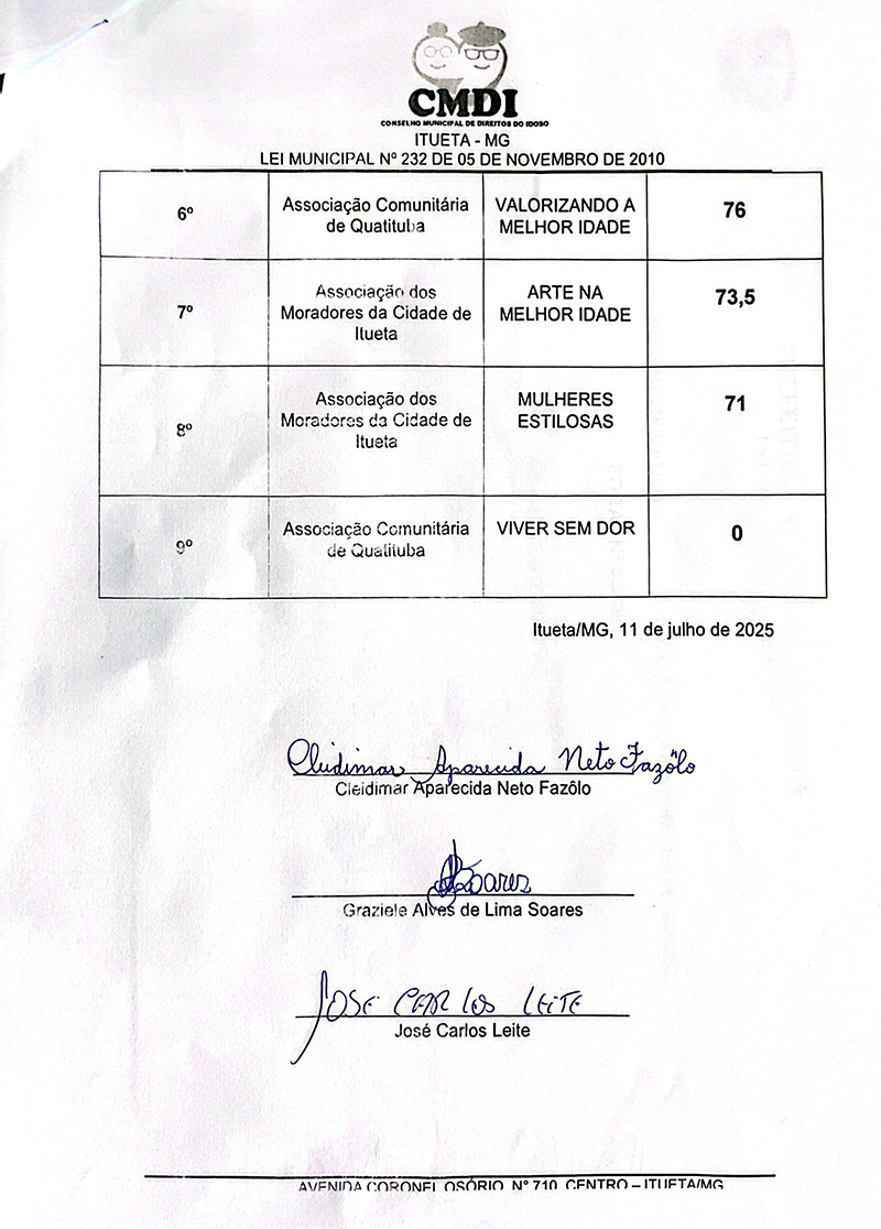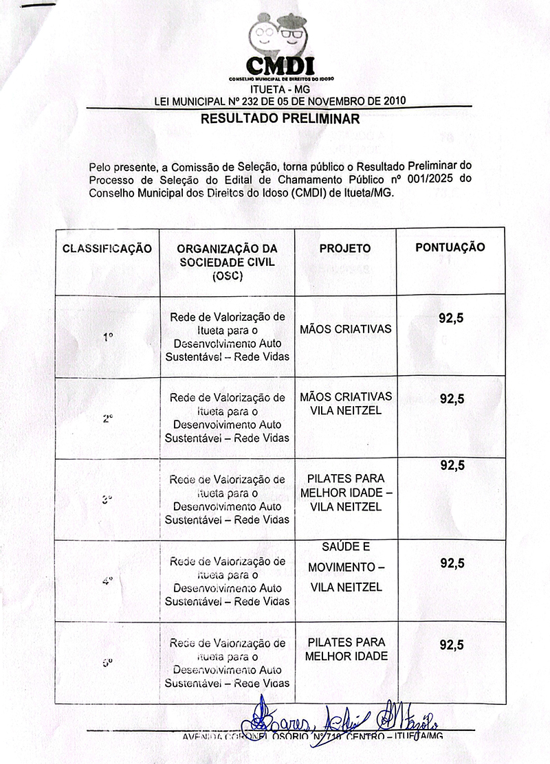 A PREFEITURA MUNICIPAL DE ITUETA-MG, por intermédio do Conselho Municipal de Direitos do Idoso – CMDI, com esteio na Lei Federal nº 13.019, de 31 de julho de 2014, torna público o RESULTADO PRELIMINAR do Edital de Chamamento Público 001/2025 visando à seleção de propostas de organizações da sociedade civil interessadas em celebrar Termo de Fomento que tem por objeto a execução de projetos com as atividades relacionadas nesse edital.
