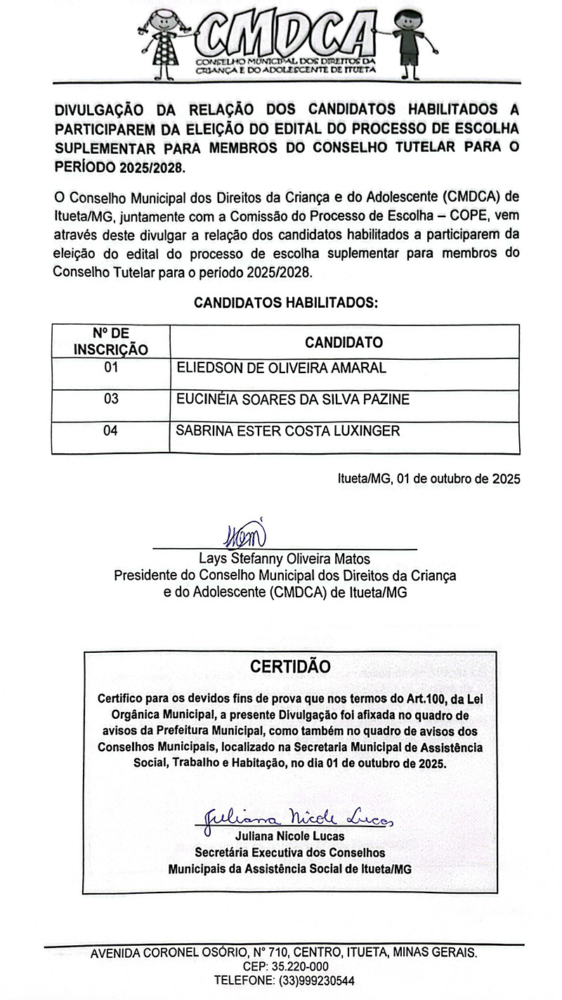 O Conselho Municipal dos Direitos da Criança e Adolescente (CMDCA) do Município de Itueta/MG , no uso de suas atribuições legais, conforme preconiza a Lei 8.069/90 - Estatuto da Criança e do Adolescente, a Lei Municipal nº 334/2019 e nº 419/2024 e a Resolução nº 170/2014 do Conselho Nacional dos Direitos da Criança e do Adolescente - CONANDA torna público a Divulgação da Relação de Candidatos Habilitados - Processo de Escolha Suplementar de membros do Conselho Tutelar para o período 2025/2028 sendo realizado sob a responsabilidade deste e a fiscalização do Ministério Público, mediante as condições estabelecidas neste Edital.