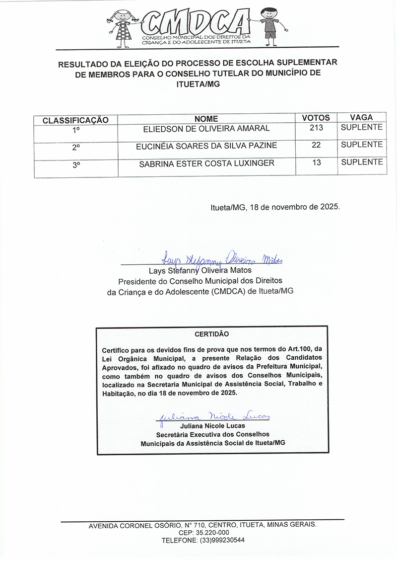 O Conselho Municipal dos Direitos da Criança e Adolescente (CMDCA) do Município de Itueta/MG , no uso de suas atribuições legais, conforme preconiza a Lei 8.069/90 - Estatuto da Criança e do Adolescente, a Lei Municipal nº 334/2019 e nº 419/2024 e a Resolução nº 170/2014 do Conselho Nacional dos Direitos da Criança e do Adolescente - CONANDA torna público o RESULTADO DA ELEIÇÃO - Processo de Escolha Suplementar de membros do Conselho Tutelar para o período 2025/2028 sendo realizado sob a responsabilidade deste e a fiscalização do Ministério Público, mediante as condições estabelecidas neste Edital.