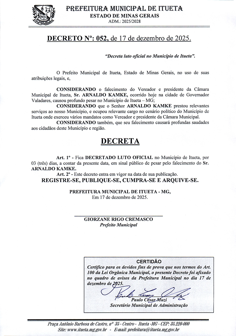O Prefeito Municipal, Sr. Giorzane Rigo Cremasco, profundamente consternado pelo falecimento do vereador e presidente da Câmara Municipal, Sr. Arnaldo Kamke (Arnaldinho), ocorrido nesta data, 17, vem por meio do Decreto nº 052, de 17 de dezembro de 2025, DECRETAR Luto Oficial de (03) três dias no município.