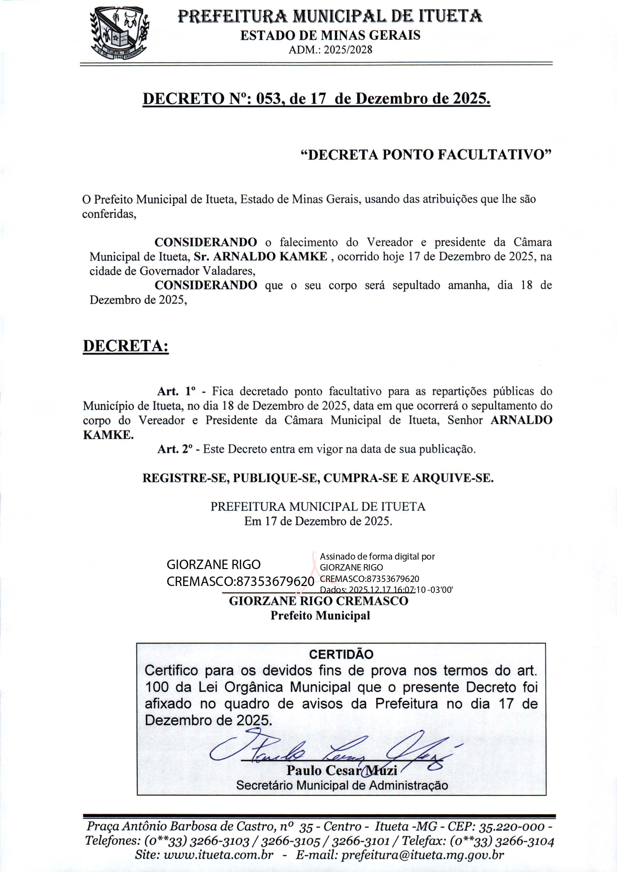 A Prefeitura Municipal de Itueta, Minas Gerais, considerando o falecimento do vereador e presidente da Câmara Municipal de Itueta, sr. ARNALDO KAMKE, ocorrido hoje (17), considerando que o seu corpo será sepultado amanhã, dia 18, decretou ponto facultativo para as repartições públicas do município para o dia 17 de dezembro de 2025. A medida se deve a comemoração do dia do Servidor Público , em data móvel.