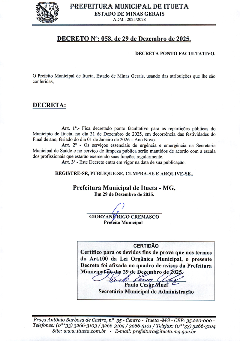 A Prefeitura Municipal de Itueta, Minas Gerais, decretou ponto facultativo para as repartições públicas do município para o dia 31 de dezembro de 2025.