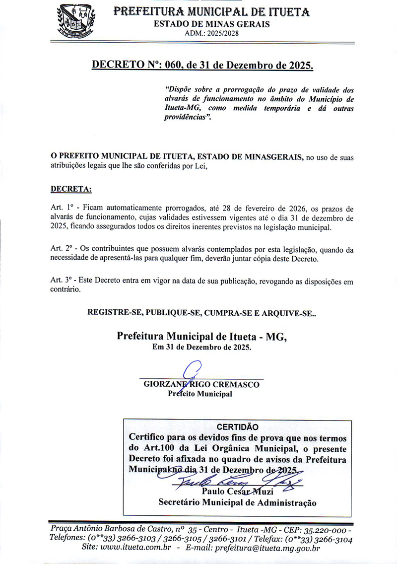 DECRETO Nº: 060, de 31 de Dezembro de 2025.