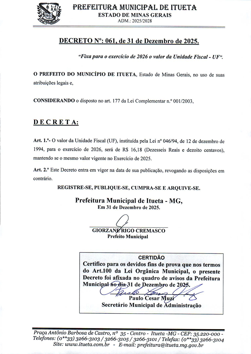Página inicial > Últimas Notícias > DECRETO Nº 061, DE 31 DE DEZEMBRO DE 2025
